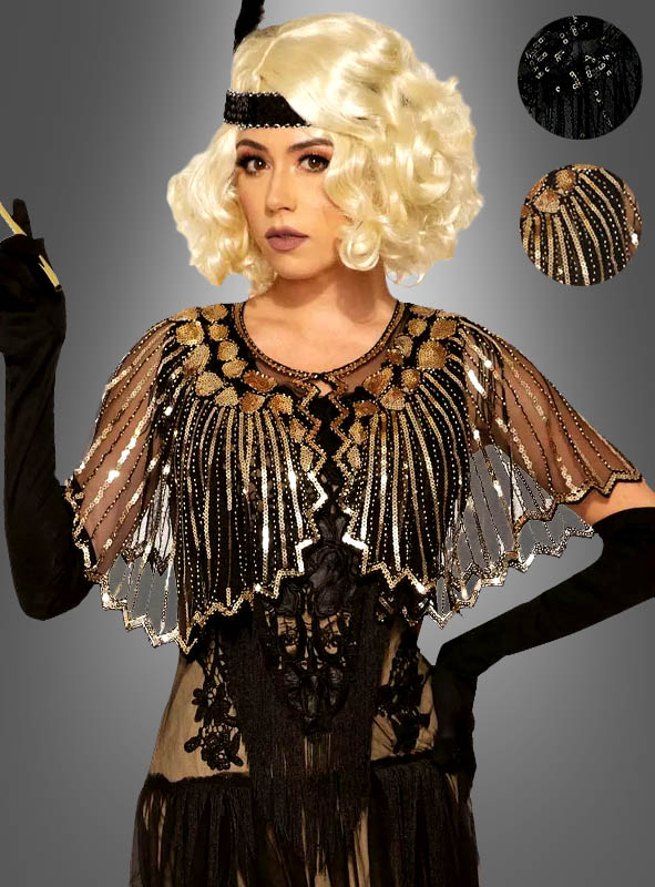 Die 20er Jahre Pailletten Stola ist das perfekte Accessoire für alle Golden Twenties Charleston Kostüme für Damen. Schultern und Oberarme werden durch den transparenten, schwarzen Stoff leicht verhüllt und kaschiert. Das schwarze Kurzcape im Art Deco Stil der 20er Jahre sorgt für ein absolut glamouröses Kostüm. Selbst auf einem schlichten, schwarzen Kleid wirkt das Cape edel und elegant.