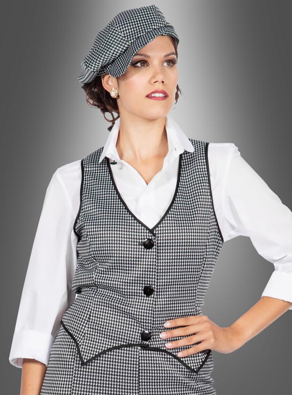 Die Weste ist vorne mit Knöpfen versehen, die man auch öffnen und schließen kann. Die Rückseite der Weste ist aus schwarzem, glänzendem Satin geschneidert. Hinten im Taillenbereich wird die Weste durch einen eingenähten Gummi gerafft und macht so eine tolle Figur. Die Schiebermütze ist ebenfalls passend aus dem Hahnentritt gemusterten Stoff genäht. Ein tolles, modisches Ensemble.
