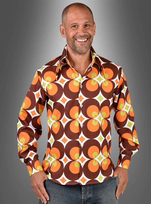 Dieses Herrenhemd erinnert an ein Tapetenmuster von damals! Auffallen mit dem Kreismuster auf dem 70er Retrohemd in braun-orange ist hier angesagt. Passend zu diesem tollen Outfit gibt es das Retrokleid für Damen. Gemeinsam werden Sie die Stars auf der nächsten Party sein.