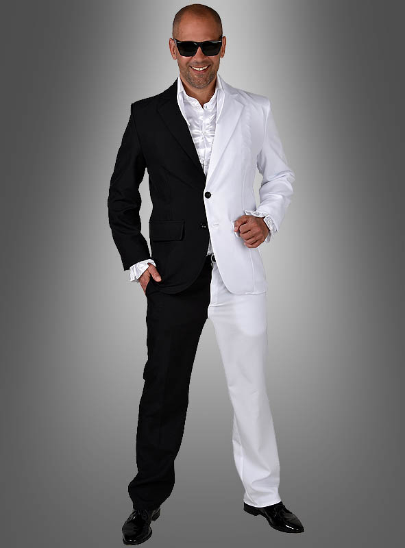 Können Sie sich farblich nicht entscheiden? Dann ziehen Sie vielleicht gerne den Anzug in halb schwarz und halb weiß an. Dieser Anzug fällt auf und ist perfekt für den Karneval oder auch für eine Black and White Party.
