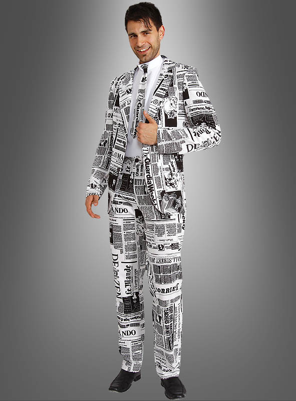 Bedruckte Anzüge mit witzigem Design sind der Renner. Mit diesem Zeitungsanzug sind Sie immer auf dem neuesten Stand, denn Sie tragen die aktuellen Schlagzeilen am Körper. Frisch aus der Druckerpresse zur nächsten Party sozusagen. Wer auffallen möchte, für den ist dieses Kostüm ideal.
