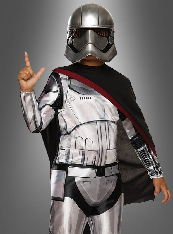 Das Star Wars Episode VII Kostüm besteht aus einem leichten Overall mit vielen aufgedruckten Details. Der Stoff ist leicht glänzend, das unterstreicht den Silbereffekt. Denn Captain Phasma trägt eine silberne Uniform und hebt sich dadurch von dem gewöhnlichen Storm Trooper ab. Die angenähten Schuhüberzieher sind gepolstert. Auf einer Schulterseite wird der schwarze Umhang mit dem bordeauxfarbenen Saum angebracht. Die Halbmaske besteht aus stabilem Kunststoff und ist innen um den Augenbereich weich gepolstert. Die Augenlöcher sind mit schwarzem Netzstoff ausgestattet.