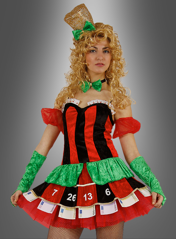Das Kleid besteht aus dehnbarem Pannesamt mit angenähtem Petticoat. Am Rockteil sind Euroscheine aus Stoff eingenäht, am Ausschnitt Spielkarten. Der glitzernde, goldene Mini-Hut wird ganz einfach mit dem angebrachten Haarreif aufgesetzt, es sind also keine Haarklammern nötig! Die separaten roten Tüllärmel, die Armstulpen aus grünem Samtstoff und die grüne Samtfliege am Satin-Halsband runden das Glück ab.