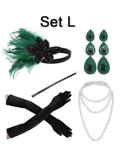 Bei den Sets ist immer ein Haarband Kopfschmuck mit echten Federn dabei. Perlenketten, die in den 20er Jahre sehr beliebt waren und ein langer Zigarettenhalter sind geradezu ein Must-have bei Golden Twenties Partys. Wenn Ohrringe im Set sind, dann benötigen Sie hier auf jeden Fall durchstochene Ohrläppchen. Denn es handelt sich um Ohrstecker. Die langen Galahandschuhe oder Armstulpen sehen sehr elegant aus.