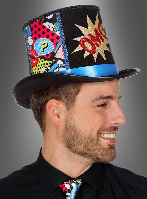 OMG! Was für ein toller Comic Zylinder Hut im Pop Art Style. Ganz im Stil der 50er Jahre Kunstbewegung ist diese Kopfbedeckung schrill und auffallend.