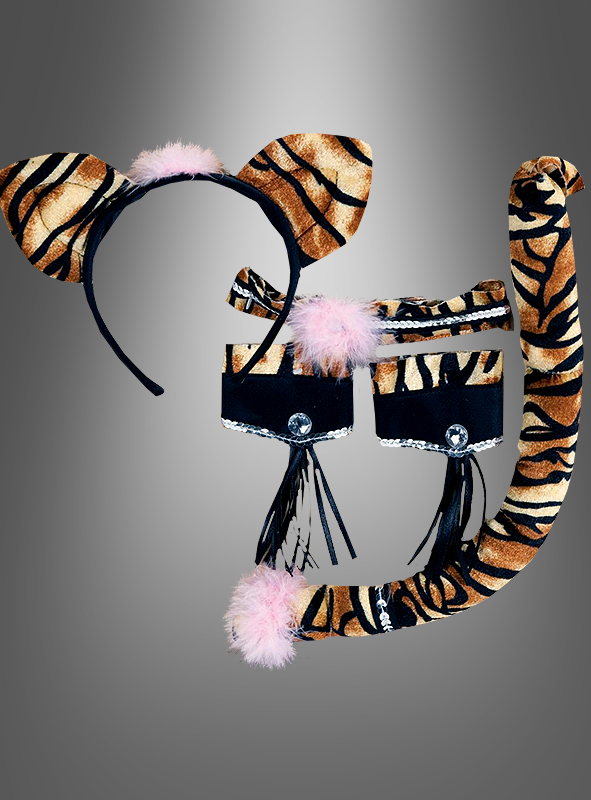 Sehr edles Tiger Kostüm Set bestehend aus Haarreif mit Ohren, Halsband, Armbänder und Tigerschwanz. Grrrrrrr! Da schnurrt die Wildkatze.