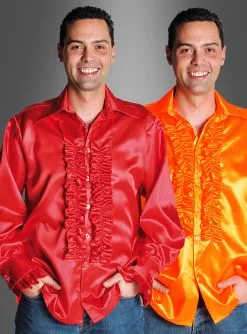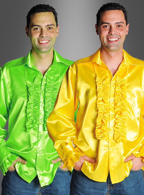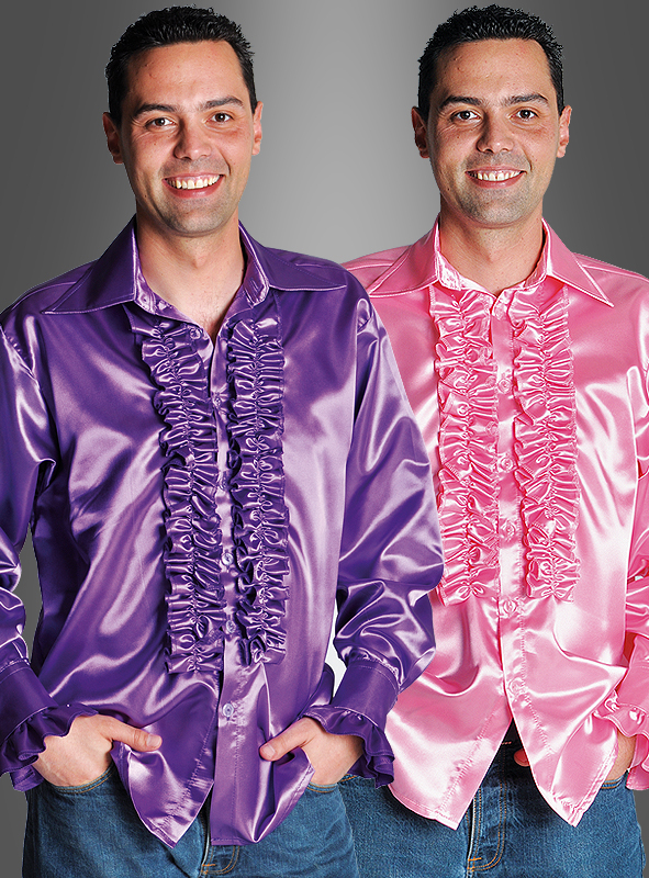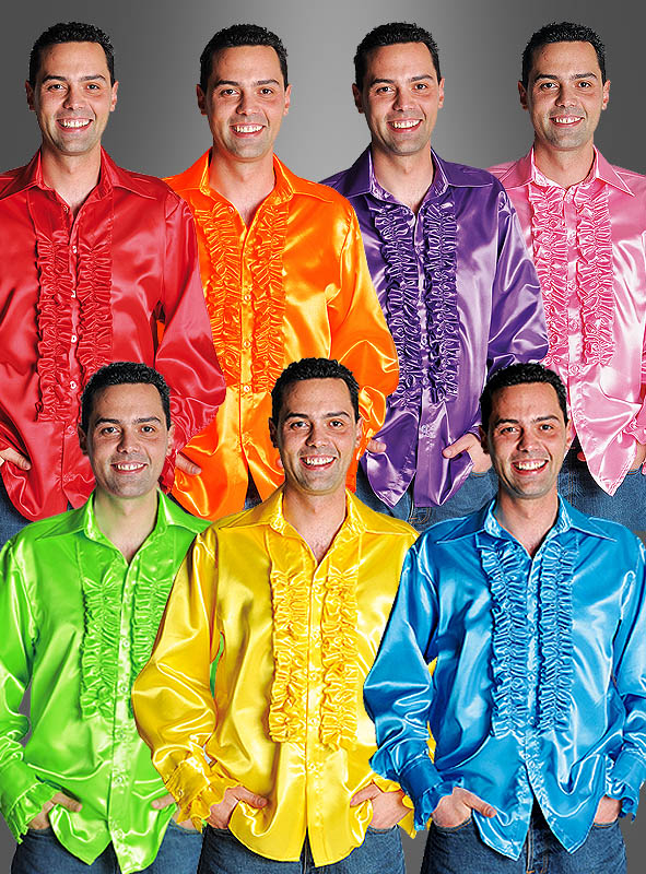Mit den Rüschenhemden aus Satin werden Sie zum Schlagerstar. Doch welche Farbe nehmen? Das ist bei diesen tollen leuchtenden Farben gar keine leichte Wahl. Noch die passende Schlaghose dazu, fertig ist das Schlager-Outfit. Auch auf dem Kölner Karneval ein farbenfrohes Kostüm.