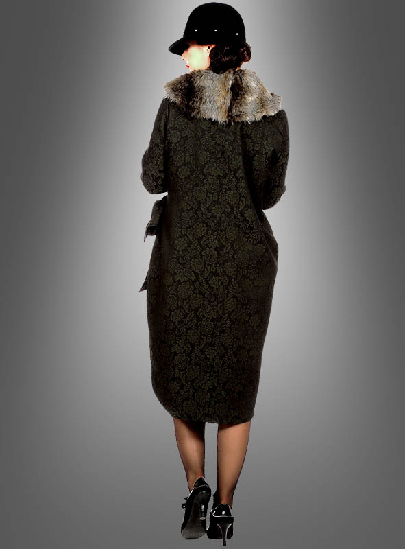 Dieser edle 20er Jahre Mantel schützt Sie vor Kälte und sieht dazu elegant und edel aus. Der schwarze Jacquardstoff ist mit einem feinen Blumenmuster durchwebt, welches in dunklem Olivgrün eine sehr edle Note in das Kleidungsstück bringt. Der Mantel ist weit geschnitten und wird seitlich mit Bändern geschlossen. Innen ist der Damenmantel mit schwarzem Satin gefüttert.