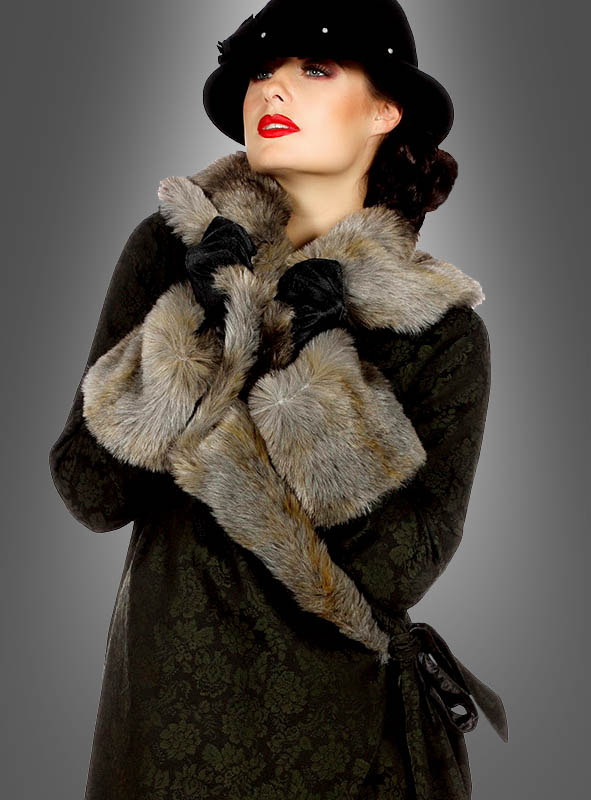Der edle 20er Jahre Mantel steht jeder Frau ausgesprochen gut. Er kaschiert gekonnt und macht eine schöne Figur. Der Mantel ist TOP verarbeitet und in toller Qualität. Jacquard Webstoff und Pelz sind einmalig. Dieser Webpelz sieht fast echt aus. Natürlich wurde für dieses Kostüm keinem Tier geschadet. Der Pelz besteht aus einem kuschelweichen Plüsch mit einmaliger Musterung. Kragen, Revers und Ärmelaufschläge sind damit großzügig verziert.
