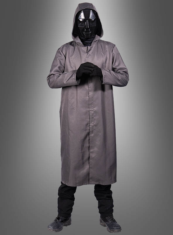 Der Mantel mit der Kapuze verhüllt den geheimnisvollen, unbekannten Mann und keiner wird Sie darin erkennen. Der lange, dunkelgraue Mantel ist vorne mit einem langen Reißverschluss ausgestattet. Der Stoff ist fest und von guter Qualität.