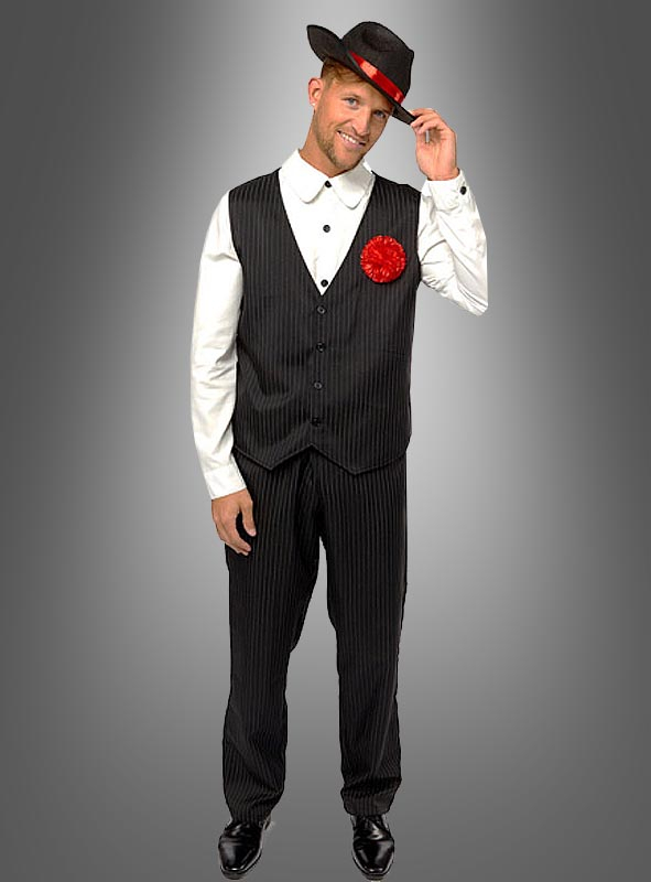 Mit dabei ist auch der schwarze Fedora Hut mit rotem Hutband. Ein perfektes Herrenkostüm für eine Gangsterparty, ein Mafia Event oder eine 20er Jahre Mottoparty.