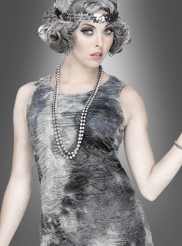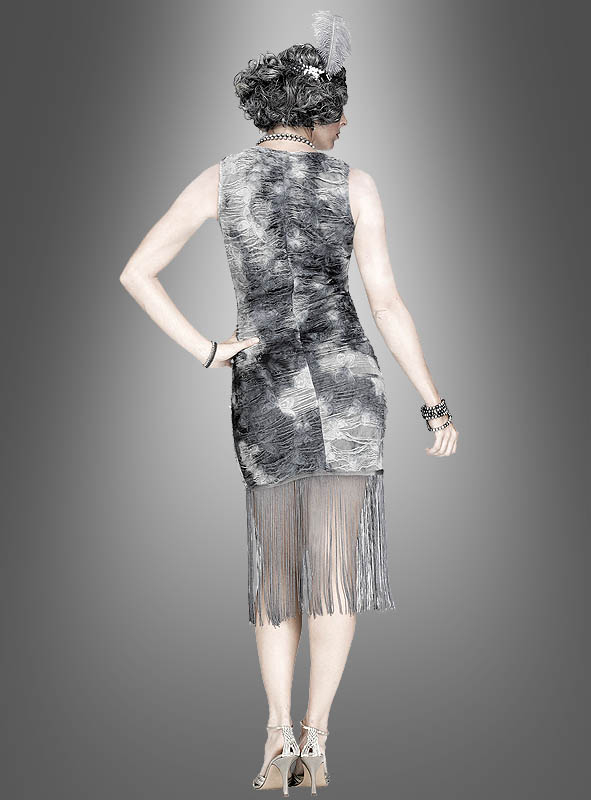 Das kurze, ärmellose Charleston-Kleid hat zwar nichts von seinem Sex-Appeal verloren, erhält aber durch die grau-schwarze Farbgebung einen morbiden Touch. Es ist sehr attraktiv auf Figur geschnitten und wird verlängert durch die Fransen, die bis weit über die Knie reichen. Ein passendes Haarband mit Feder, das in den 20er Jahren total angesagt war, darf natürlich nicht fehlen und ist im Lieferumfang bereits enthalten.