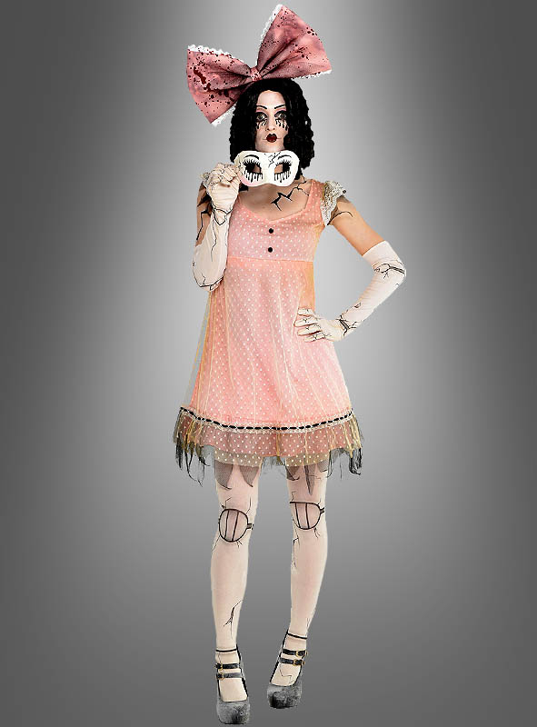 Perfekt wird das gruselige Puppen Kostüm für Damen durch die hellrosa Strumpfhose und die langen hellgelben Handschuhe. Denn hier sind nicht nur die Risse der kaputten Porzellanpuppe aufgedruckt, sondern auch die Gelenke. Das macht dieses Kostüm zu einer einzigartigen Verkleidung.