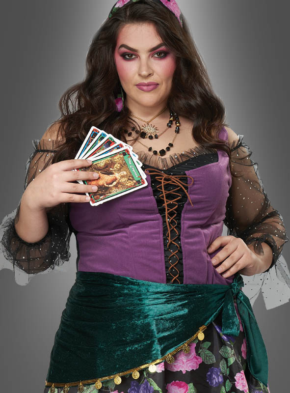 Im Hellseherin Kostüm XXL fühlt sich Madame Sara sehr wohl. Sie legt die Tarotkarten oder liest den Partygästen die Zukunft aus der Hand. Geheimnisvoll und immer in Kontakt mit dem Jenseits.