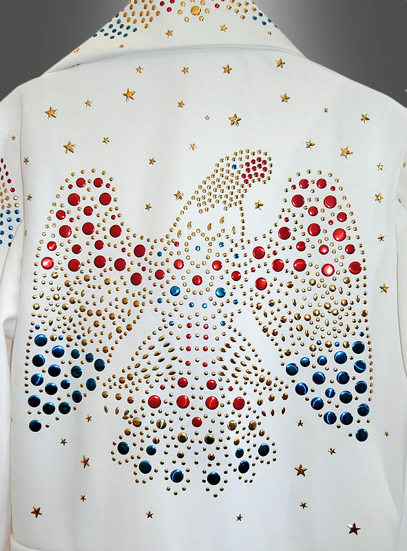 Der Einteiler Overall ist mit vielen bunten Steinchen im Brustbereich besetzt. Auch im Rückenbereich ist der Adler mit bunten Ziersteinen appliziert. Auf dem Gürtel sind ebenfalls Ziersteine und außerdem der US-Adler aus massivem Metall und Ketten in goldener Farbe zur Verzierung angebracht. Der rote Schal ist ebenfalls enthalten.