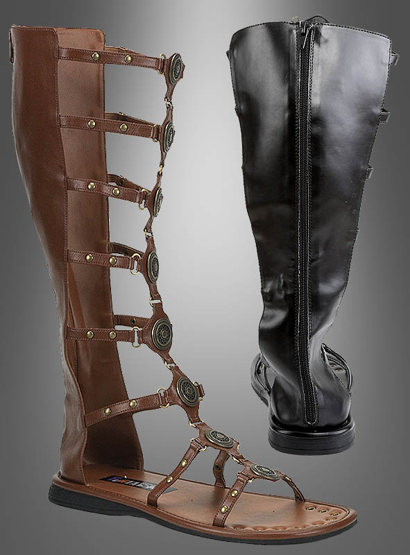 Je nachdem welches Kostüm Sie tragen, bieten wir die Sandalen aus Kunstleder in den Farben Schwarz oder Braun an. Die einzelnen Riemen sind mit Nieten und kleinen Zierscheiben versehen.