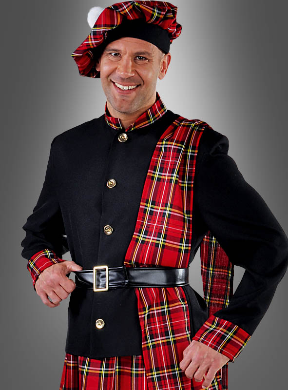 Schwarze Jacke mit Zierknöpfen, karierten Ärmelaufschlägen und Stehkragen. Schottenrock und Schärpe sind ebenfalls in schönem rotem Schottenkaro gehalten. Gürtel aus schwarzem Kunstleder mit goldener Gürtelschnalle. Bequeme Mütze mit Pompon.