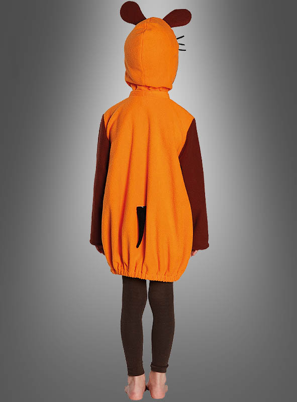 Das Mauskostüm besteht aus einem langärmeligen Oberteil aus weichem Fleece, das bis zu den Oberschenkeln reicht. Es ist in Orange gehalten, nur die Ärmel sind braun. Natürlich darf auch die lustige Kapuze nicht fehlen, die das Gesicht der Maus darstellt. Ohren, Nase mit Schnurrhaaren und Augen der Maus sind angenäht. Vorne am Ausschnitt ist ein kleiner Schlitz mit Knopf eingearbeitet. Der Saum ist hier und rund um die Kapuze mit braunem Schrägband eingefasst. Auf der Rückseite des Oberteils ist der Mauseschwanz befestigt.