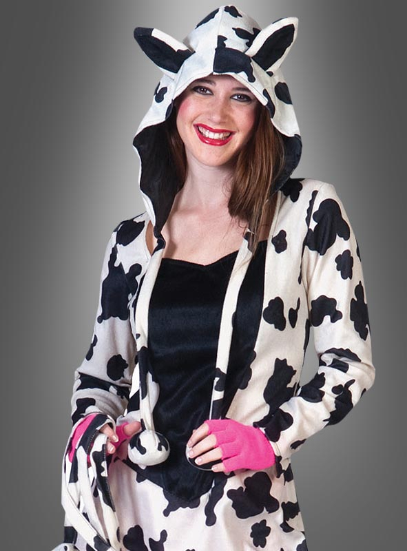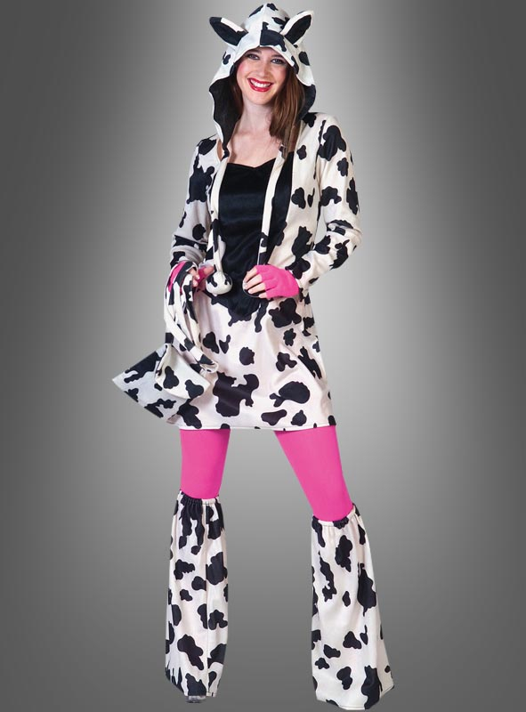 Das Kostüm besteht aus einem Kleid in geflecktem Kuhmuster mit schwarzem Frontbereich. Der Stoff ist samtig weich und angenehm zu tragen. Auf der Rückseite des Kleids befindet sich ein Reißverschluss, der das Aus- und Anziehen vereinfacht. Die weite Kapuze mit den Ohren und angenähten Bommeln kann man separat tragen. Die Beinstulpen werden durch elastischen Gummibund über dem Knie gehalten.