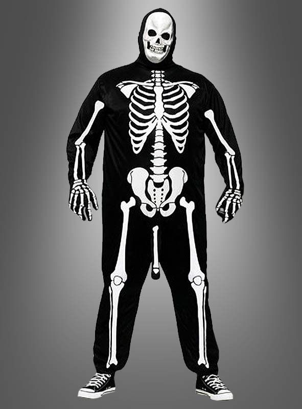 Ganzkörperanzug aus bequemen dehnbarem Stoff mit tollem Knochen Skelett Druck. Im Rücken ist ein Klettverschluss angebracht. Der Clou ist der weich-wattierte Penis Knochen. Hier können Sie locker mit allen anderen Männern mithalten. Ebenfalls enthalten sind die Totenkopf Halbmaske mit angenähter Kapuze.