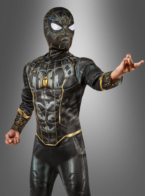 Natürlich ist auch die Spiderman Stoffmaske mit dabei, durch die man aber wegen dem weißen Netzstoff gut durchsehen kann. In diesem schwarz-goldenen Outfit sieht der Superheld düster und geheimnisvoll aus. Dieses Kinderkostüm ist unschlagbar cool.