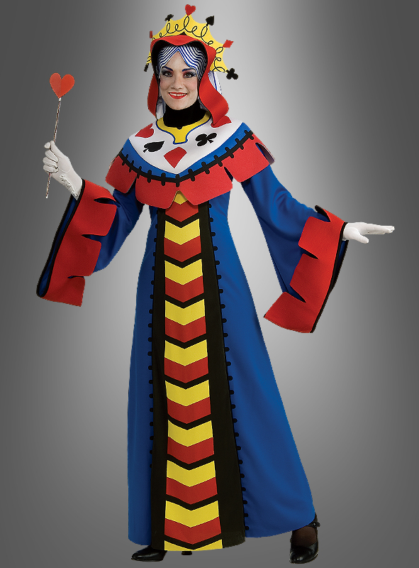 Lange Robe mit weiten Ärmeln. Der breite Schulterkragen und Ärmelabschluss sind mit Schaumstoff gepolstert. Reißverschluss im Rückenbereich. Tolle Farben und Spielkartenmuster. Die Krone aus Stoff ist mit dünnem Schaumstoff unterlegt, damit sie schön steht. Die blau-weißen Haare aus Stoff sind angenäht. Man trägt die Krone wie ein Haarband.