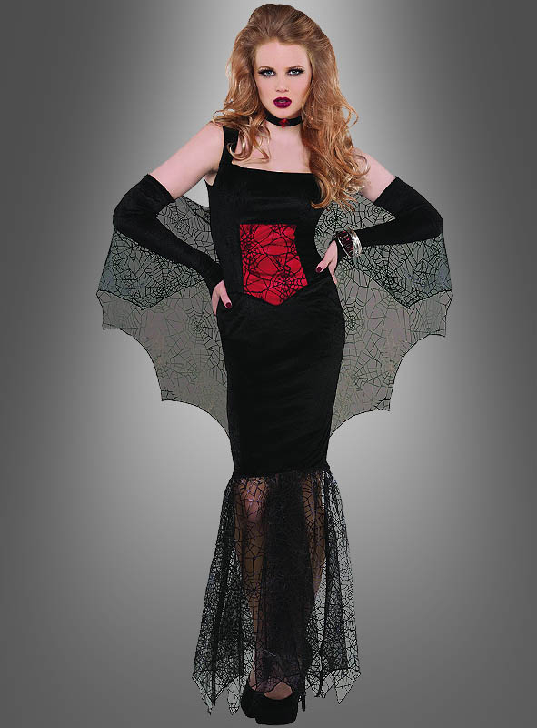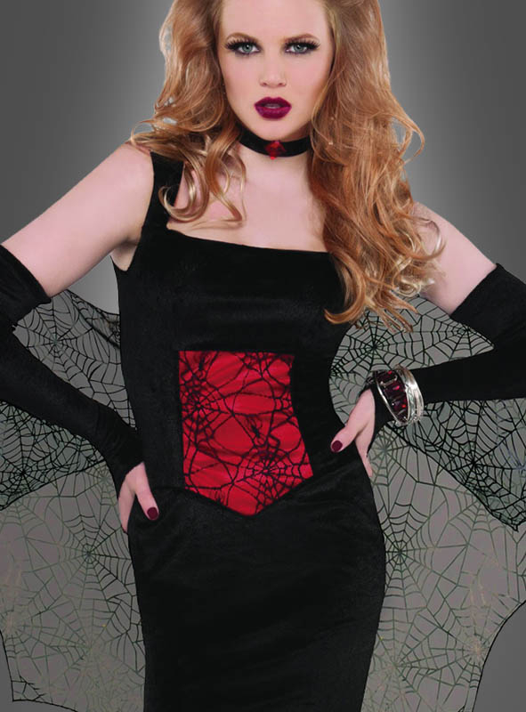 Das Halloween Spinnenkostüm für Damen besteht aus einem schmalen schwarzen Stretch-Kleid aus edlem Samt und einem Umhang. Das Kleid ist ärmellos mit komfortablen ca. 5 cm breiten Trägern. Die raffinierte Nahtführung erzeugt eine Korsagen-Optik. Das Mittelteil wird extra betont: mit einem blutroten Satineinsatz und zarter schwarzer Spitze darüber. So kommt das Halloween Spinnen-Kostüm für Damen sehr sexy daher.