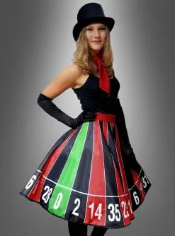 Mit dem Tellerrock Roulette Rad tanzen Sie mit Schwung durch die Las Vegas Mottoparty oder als Casino Glücksfee im Karneval. Wenn Sie sich im Kreis drehen, entfaltet der knielange Midi Rock seine ganze Pracht.