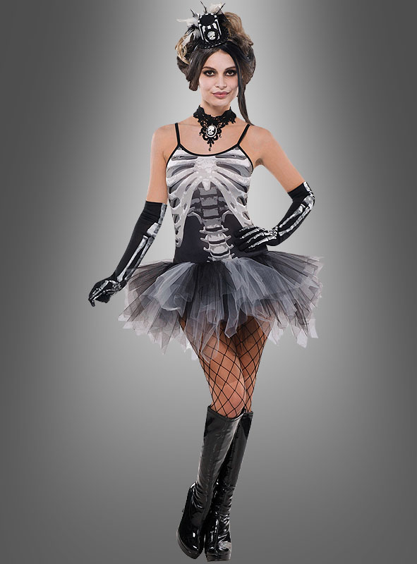 Halloweenkostüm für sexy Ballerinas mit tollem Skelett Knochen Print vorne und auf der Rückseite. Die schmalen Träger sind verstellbar. Der Stoff ist dehnbar und passt sich wunderbar den Konturen des Körpers an. Angenäht ist ein mehrlagiger sehr voluminöser Tüllrock, der auf der Hüfte unterhalb der Taille sitzen soll. Sehr kurz und sexy!