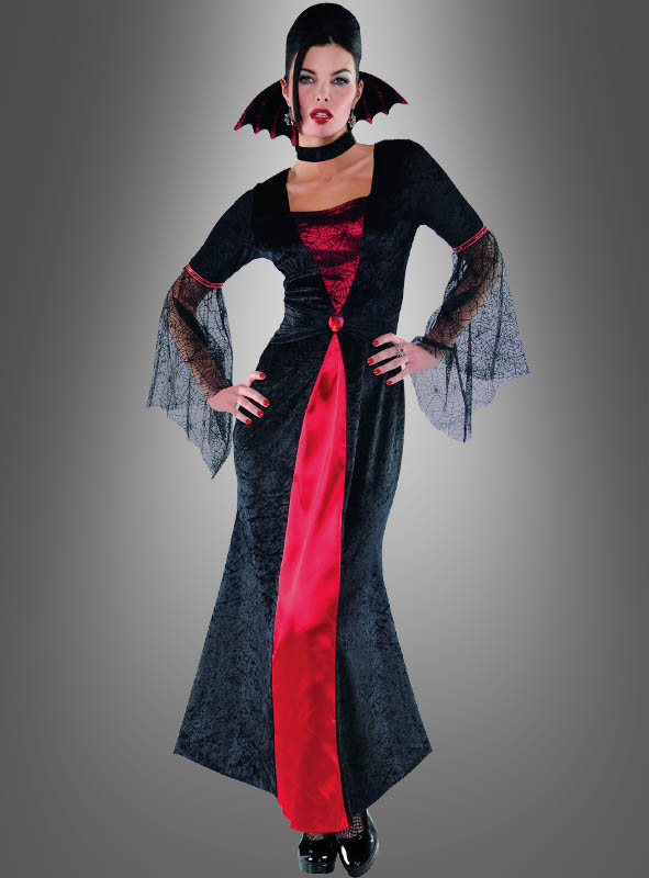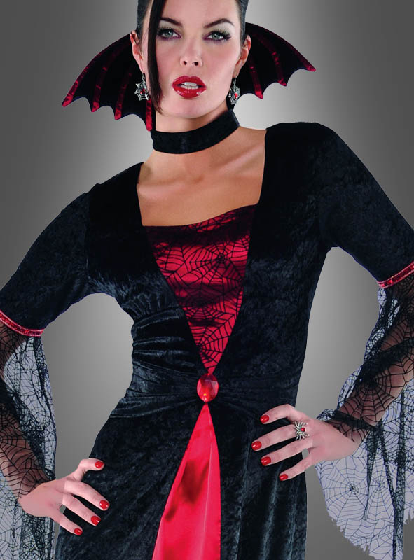 Das lange Kleid ist aus schwarzem Pannesamt genäht und körpernah geschnitten. Da der Stoff dehnbar ist, passt er sich wunderbar Ihrer Figur an. Vorne ist ein Keil aus rotem Satin eingenäht. Ein blutroter Schmuckstein ziert die Mitte. Im Brustbereich ist der rote Satin zusätzlich mit schwarzem Tüllstoff belegt, der ein schönes Spinnenwebmuster aufweist. Die Ärmel aus Samt gehen bis oberhalb der Ellbogen. Daran sind weite Tüllärmel, ebenfalls mit Spinnenwebmuster angenäht. Ein Zierband aus roten Pailletten am Übergang lässt Sie im Licht der Party glänzen. Der separate Kragen in Fledermausflügel-Form ist aus gepolstertem Samt genäht und mit roten Satinbändern besetzt. Das schwarze weiche Samtband mit Klettverschluss ist daran befestigt und wird um den Hals getragen. Das Vampira Kostüm im Gothic Style ist eine tolle Verkleidung für Halloween, Karneval und gruselige Mottopartys.