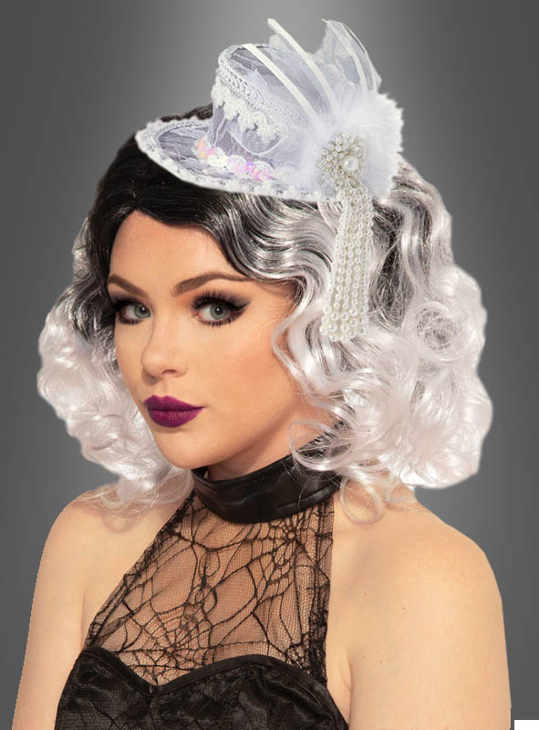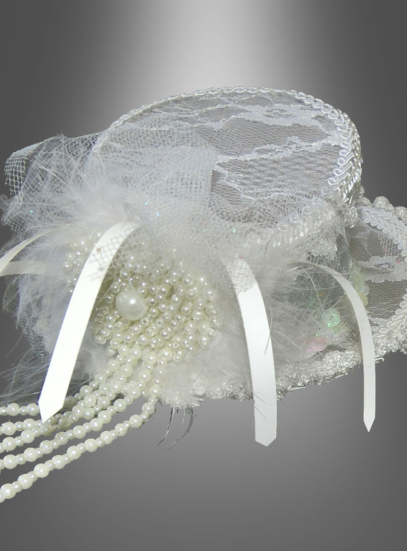 Der kleine Zylinder ist aus glänzendem, hellgrauem Satin bezogen mit weißer Spitze. Eine Brosche aus weißen Federn und einem Rondell aus weißen Perlen mit Perlenquaste macht diesen Minihut zu etwas wirklich Besonderem. Zusätzlich zum weißen Spitzenstoff ist der kleine Zylinder noch mit Posamenten Borte und irisierenden Pailletten geschmückt. Ein rauteförmiger, geschliffener Edelstein ist ebenfalls angebracht. Tüll mit kleinen glitzernden Punkten und weiße Ziersteifen geben dem Zylinder den letzten Schliff.