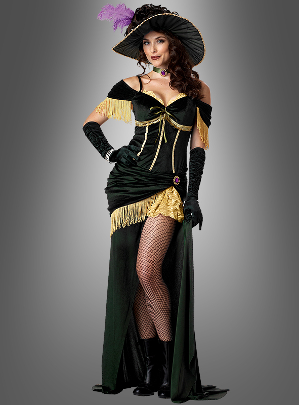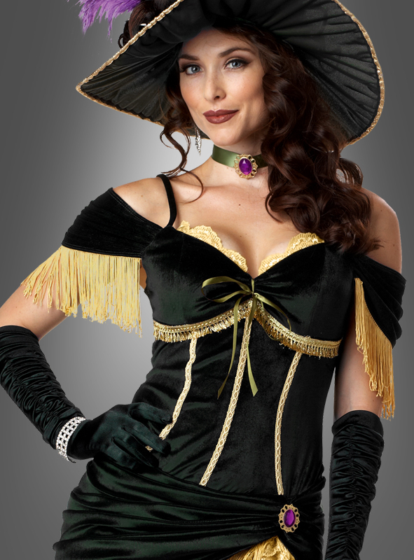 Das dunkle Western Samtkleid ist mit goldener Borte verziert und sehr hochwertig verarbeitet. Die Farbe des Kleides ist ein ganz dunkles grün, das durch den Pannesamtstoff sehr edel schimmert. Sehr schöne Raffung im Rockbereich. Ärmel und Schößchen Rock sind mit langen Fransen verziert. Das Kleid ist hinten sehr lang mit Schleppe. Der dehnbarer Stoff ist ideal für größere Oberweite. Die Ärmel werden über der Schulter getragen. Dünnere Träger aus Samtstoff geben zusätzlich Halt. Am Ausschnitt ist wundervolle Spitze eingenäht. Niicht mit im Lieferumfang sind auch ein Satinband mit Schmuckstein.