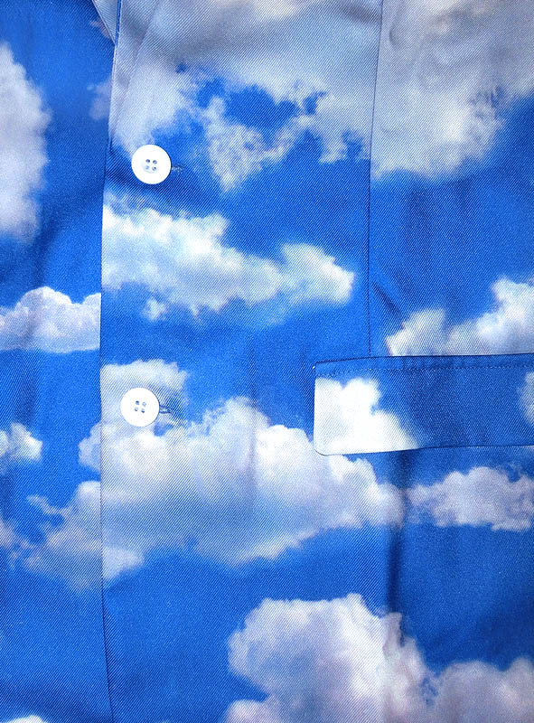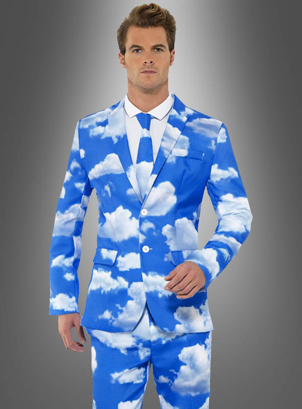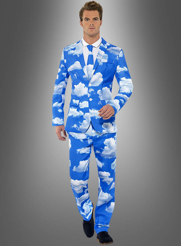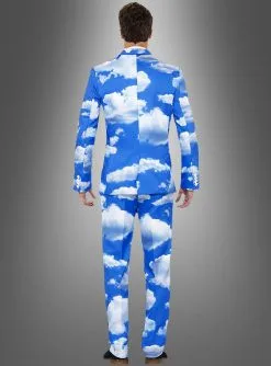 Das lustige himmelblaue Kostüm ist komplett mit fotorealistischen Wolken bedruckt. Die Wolken sind weiß-grau und machen haben einen leichten rosa Stich ins Abendrot. Das witzige Herrenkostüm besteht aus einem knöpfbaren Jackett, Hose und Krawatte.