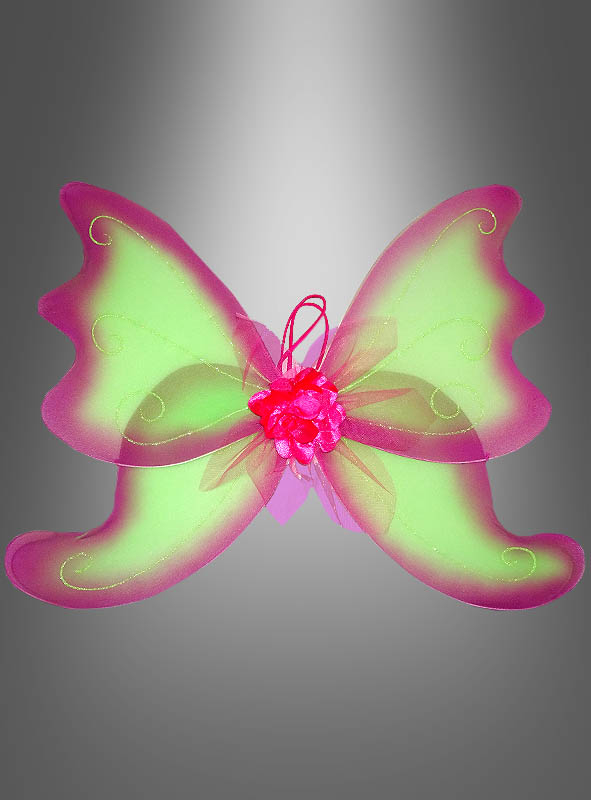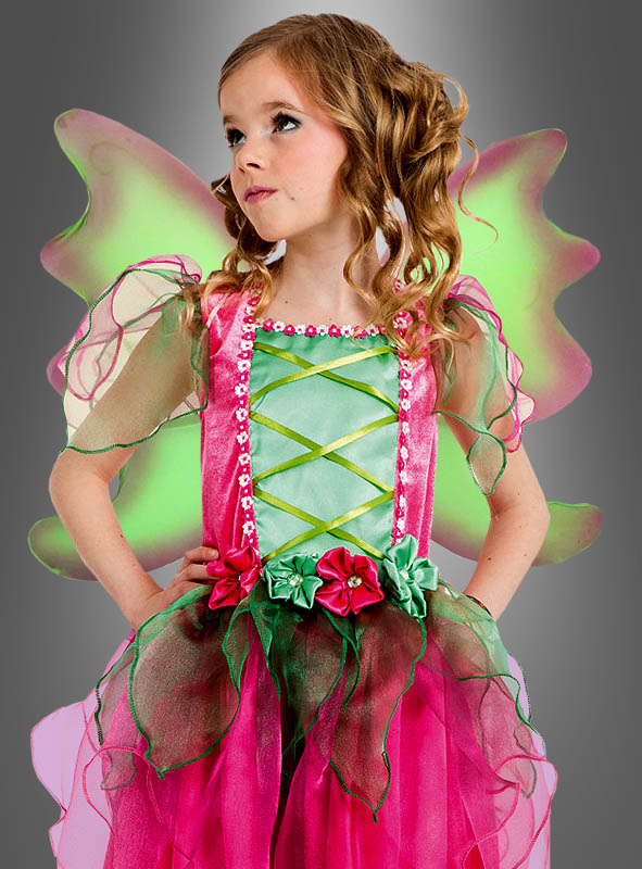 Natürlich dürfen bei einem Feenkostüm für Mädchen die Flügel nicht fehlen. Sie sind zweifarbig grün und rosa gestaltet und mit glitzernden Blütenranken verschönert. In der Mitte zwischen den Schwingen ist eine große rosa Blüte mit unterlegtem Tüllstoff angebracht. Die feinen Elfenflügel aus Nylon werden wie ein Rucksack umgeschnallt. Dieses Kinderkostüm ist ein Traum!